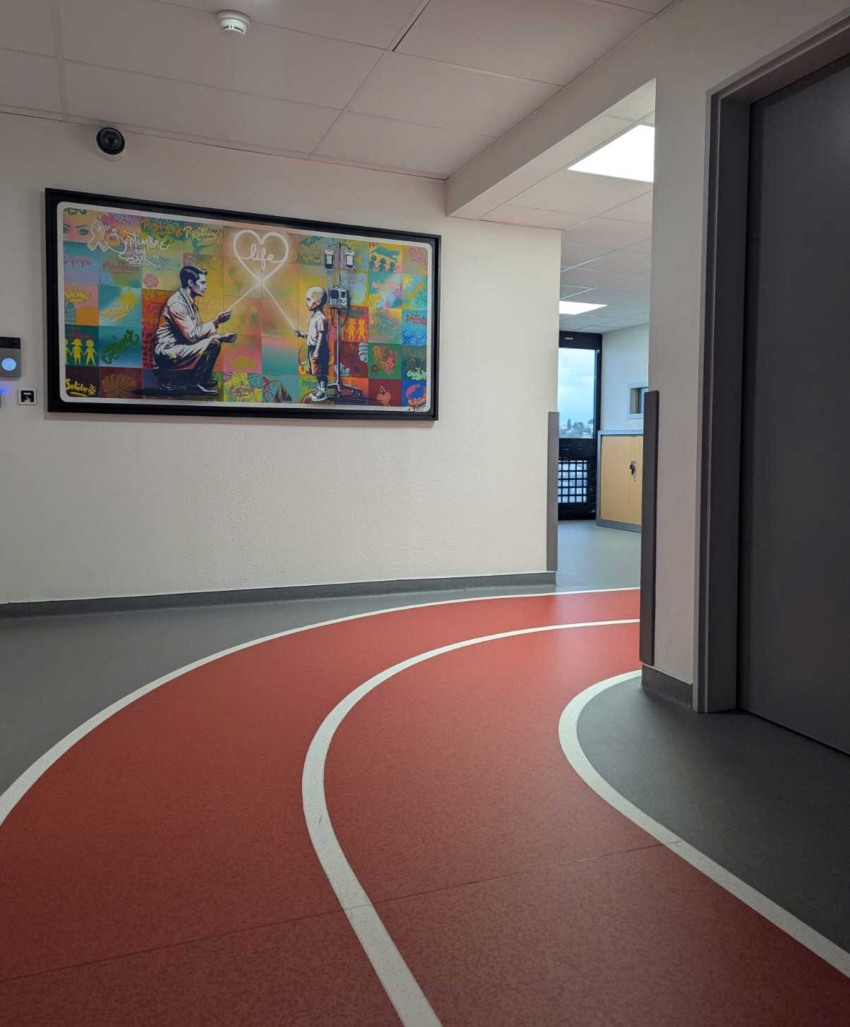 Grâce à 23 250 € financés par les Pièces Jaunes en 2023, un espace sportif partagé a été aménagé dans le hall d’accueil du service d’onco-hématologie pédiatrique, où les enfants pris en charge souffrent principalement de cancers ou de maladies du sang.